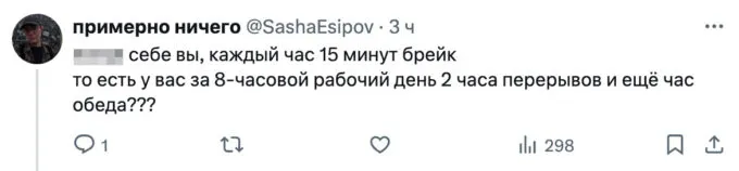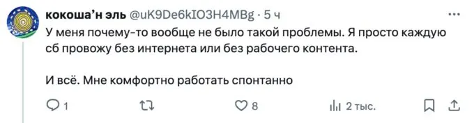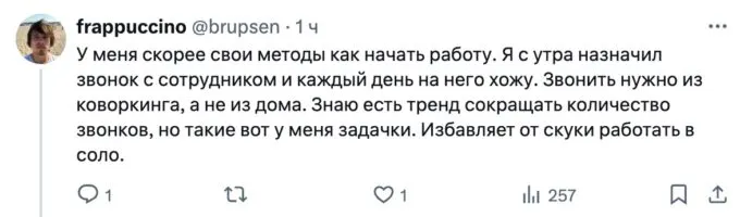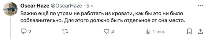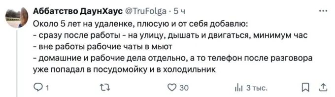 Мужчина рассказал и о физкультуре. Так, по вечерам он гуляет и занимается силовой тренировкой: «Без спорта кукуха отлетает (а я головой деньги зарабатываю)». Кроме того, в выходные автор запретил себе открывать компьютер — даже личный. Автор считает, что если не выкидывать работу из головы, то можно свихнуться: «[Удаленка] — яд медленный, но эффективный».