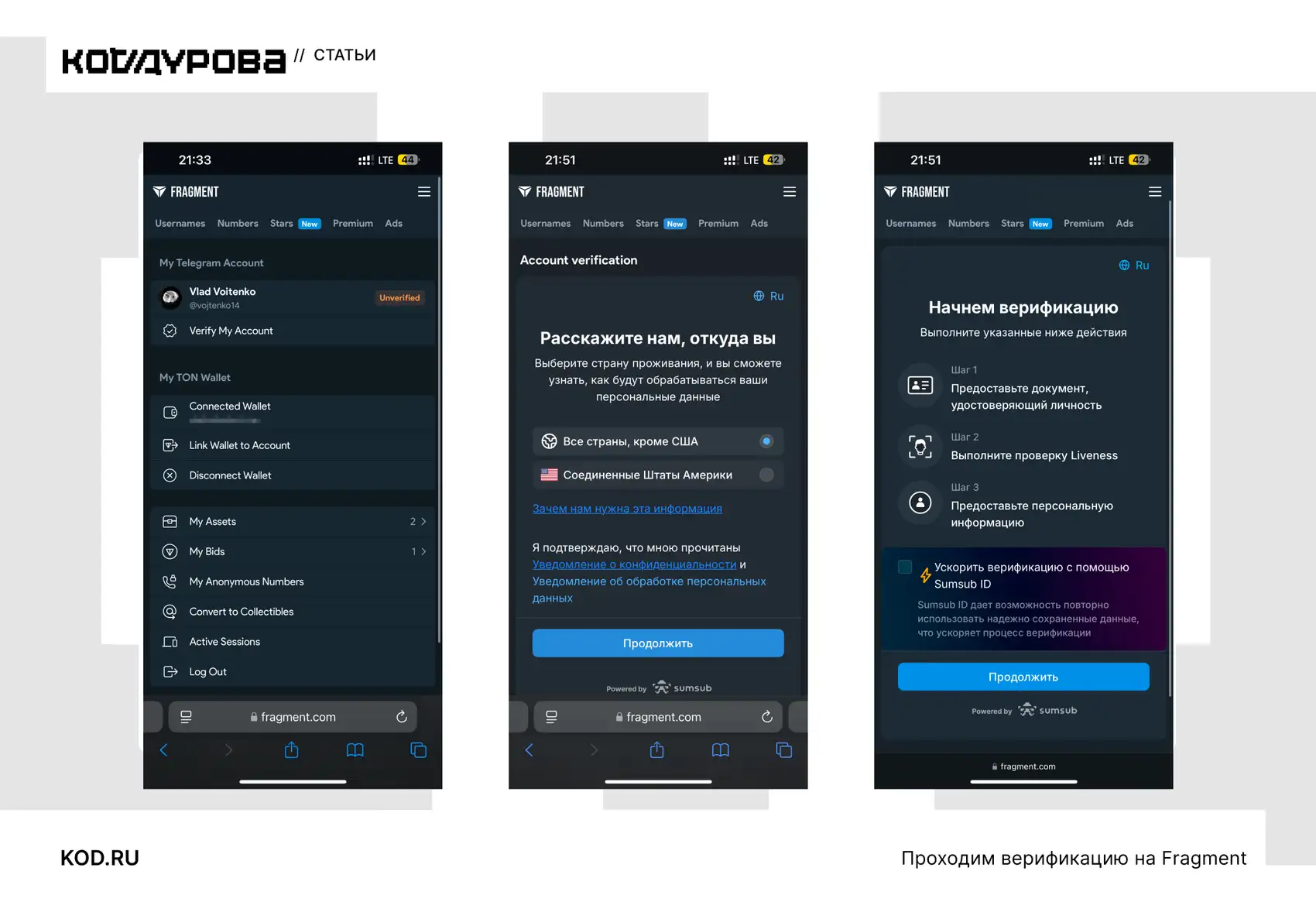 Для перевода коллекционного подарка в TON нужно зайти на площадку Fragment — она связана с Telegram и позволяет покупать никнеймы, «звезды», подписки и прочее за криптовалюту. Там необходимо пройти верификацию KYC.