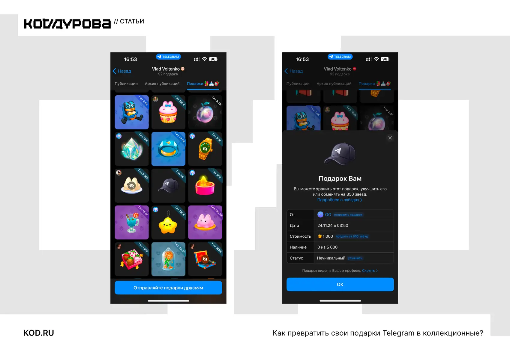 В 2024 году в Telegram появилась возможность дарить подарки пользователям внутри мессенджера. Как заметили авторы «Кода Дурова», на днях платформа разрешила переводить коллекционные подарки на блокчейн TON и продавать их там за криптовалюту.
