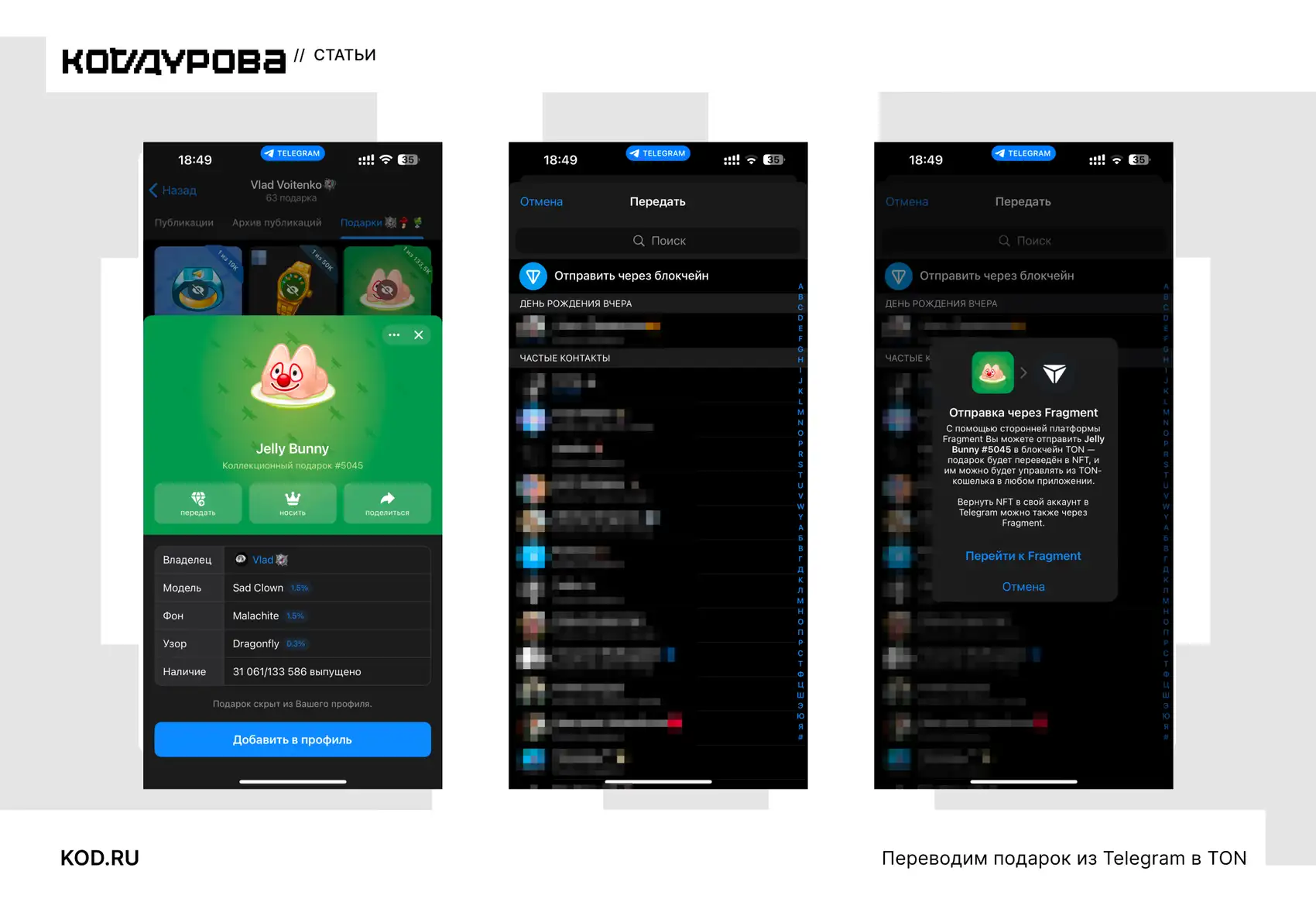 После того, как вы подтвердили профиль на Fragment, можно возвращаться в телеграм. Здесь выбираем свой подарок, нажимаем на кнопку «Передать», затем «Отправить через блокчейн». После этого отправляем его на Fragment — подарок появится в виде NFT в специальном разделе.