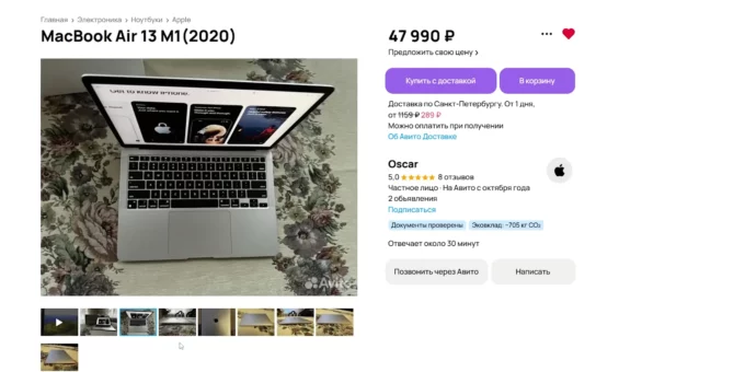 Крутым вариантом эксперт считает MacBook Air на чипе M1, который имеет прочный корпус, прекрасный 2К-экран с отличной калибровкой, шустрый чип, жирную автономность. Новый «эйр» можно купить за 68 тысяч рублей, но если вы хотите уложиться в бюджет, то ищите на Авито модели за 46-47 тысяч рублей.