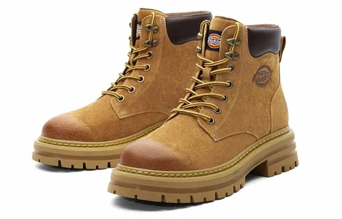 Начинаем с классики. Перед вами высокие ботинки от британцев из Dickies – одного из главных workwear-брендов. Это водоотталкивающий и износостойкий айтем, выполненный в земляном желтом цвете.