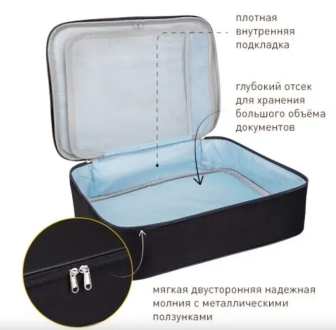 Компактный органайзер сохранит документы в специальном отделе. В подкладку можно положить главные доки, а в основной отсек — все оставшееся. Он поместится в любом рюкзаке. Сзади есть эластичная лента, с которой органайзер можно будет пристроить на телескопической ручке чемодана.