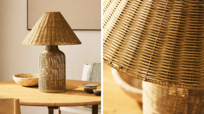 Завершаем подборку с помощью светло-бежевой настольной лампы, выполненной из ротанга – натурального материала для плетения. Просто взгляните на дизайн – есть нехилая вероятность, что любой ваш гость захочет такой же айтем, как только впервые увидит его.