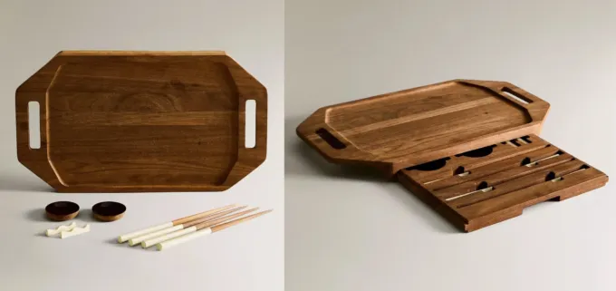 Начнем с небольшого, но очень приятного набора, который наверняка найдет место на вашей кухне. Это деревянный набор для сервировки суши на двоих – идеальный айтем для фанатов японской кухни. Тут вам и поднос из древесины акации (с ручками и выдвижным ящичком), и палочки для еды, и мини-чаши для соевого соуса. Выглядит потрясно.