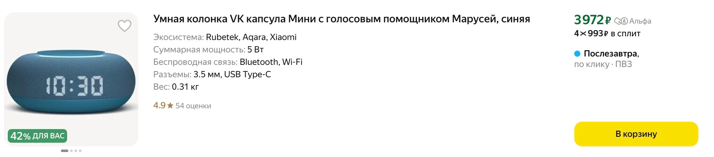 Раз устройства «Яндекса» подорожали, идем к конкуренту. Пользователям экосистемы VK советуем прикроватную (или кухонную) колонку «Капсула Мини» — гаджет с часами стоит всего 4 тысячи рублей (ценник упал почти на 3 тысячи рублей). Предложение недели!