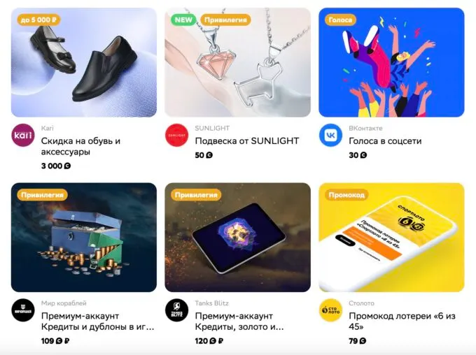 • Купоны и сертификаты. В этом разделе можно покупать купоны и обменивать их на определенные услуги или товары. Например, сертификат на обувь или одежду в онлайн-магазине или лотерейный билет. Приятно, что у многих партнеров баллы можно гасить в справедливой пропорции (1 балл = 1 рубль).