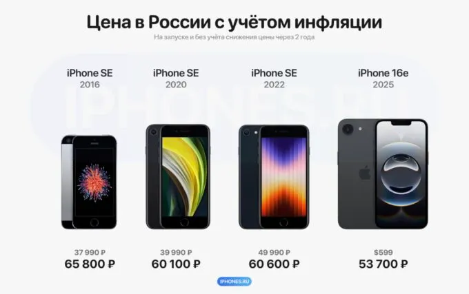 Специалист сравнил цены на момент запуска всех моделей SE и 16e, а затем прикинул, сколько модели 2016, 2020 и 2022 годов стоили бы в России сейчас. Оказалось, что за самый первый SE пришлось бы заплатить 65 800 рублей.