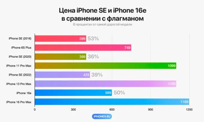 При этом SE — всегда компромиссное предложение. Его покупали, чтобы сэкономить деньги. Павел подсчитал, что стоимость оригинального iPhone SE на старте составляла 53% от самого дорогого флагмана. При этом 16e стоит даже дешевле — 50% от стоимости iPhone 16 Pro Max.