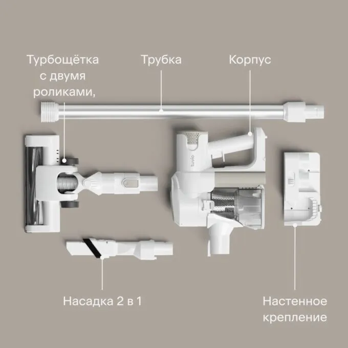 Без подзарядки Tuvio TS02HBHW выдаёт до 45 минут работы. Этого вполне хватит, чтобы убраться в квартире площадью до 100 кв. м. В комплекте идёт насадка 2-в-1 (щелевая и для мебели), а также станция для зарядки в виде настенного крепления. Ещё наш лот может похвастаться почти бесшумной работой и цифровым индикатором заряда.