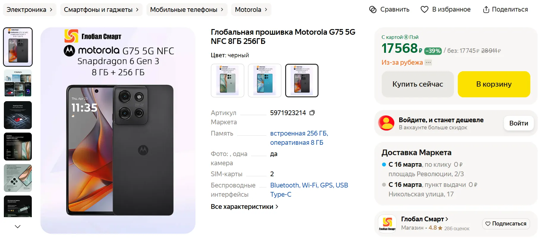 Хорошо, что Motorola в конце 2024 представила по-настоящему шикарное и недорогое устройство с ЖК-матрицей. Речь про модель G75 — на Маркете за нее просят всего 17 750 рублей.