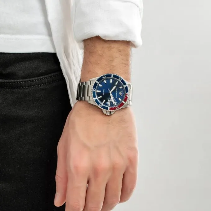Строгие и стильные кварцевые часы от итальянского бренда Emporio Armani отдалённо напоминают более премиальные Rolex GMT-Master в «пепсикольной» расцветке. Только этот лот стоит в 100 раз дешевле. Модель Emporio Armani Diver AR11339 получила 42-мм корпус из стали, вращающийся безель и минеральное стекло.