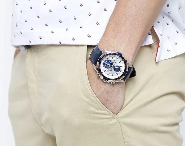 На циферблате Casio Edifice EFR-539L-7C есть окно с датой, секундомер с точностью показаний 1/10 с и временем измерения 1 ч. Заявленной влагозащиты 100WR хватит для плавания в бассейне, но нырять с аквалангом в них нельзя. Такие часы отлично подойдут под любой тип одежды для на каждый день.