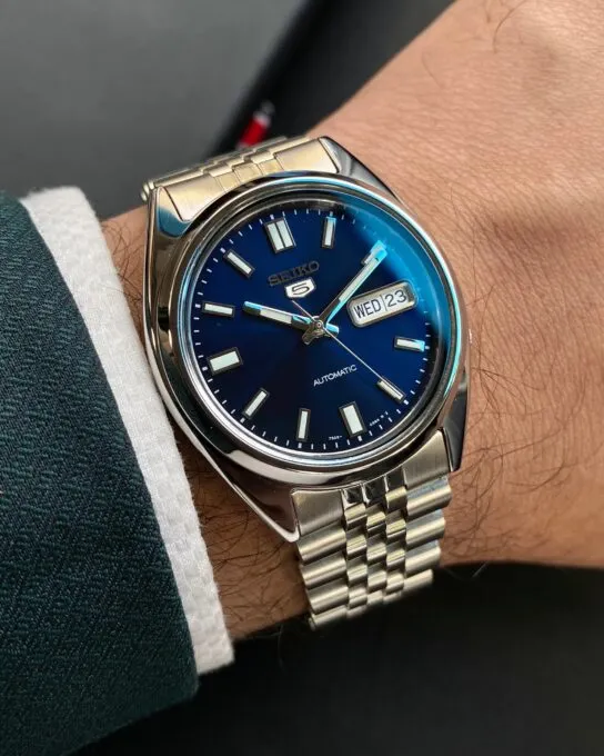 Seiko 5 могут похвастаться стальным корпусом с минеральным стеклом, двойным окошком даты и дня недели, а также смещённой заводной головкой. Довольно необычное дизайнерское решение, которое сразу же бросается в глаза. Ещё из бонусов — влагозащита 30WR (от дождя и брызг) и прочный стальной браслет.