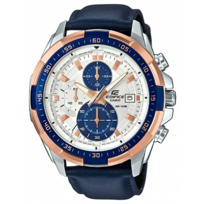 Если вы думали, что в ассортименте японских часоделов только винтажные модели и серия G-Shock с массивным ударопрочным корпусом, предлагаем вам ознакомиться с линейкой Edifice. Эти кварцевые часики представляют собой стандартный большой хронограф со стальным корпусом с напылением под розовое золото, кожаным ремешком и минеральным стеклом.