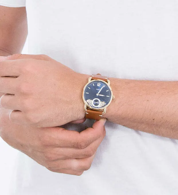 Те самые часы от американского бренда Fossil, которые выглядят не хуже Ulysses Nardin, но стоят вполне адекватных денег. Модель Commuter Twist сочетает круглый корпус из нержавеющей стали в золотистом цвете с тёмно-синим циферблатом, прикрытым минеральным стеклом. Премиальное комбо.