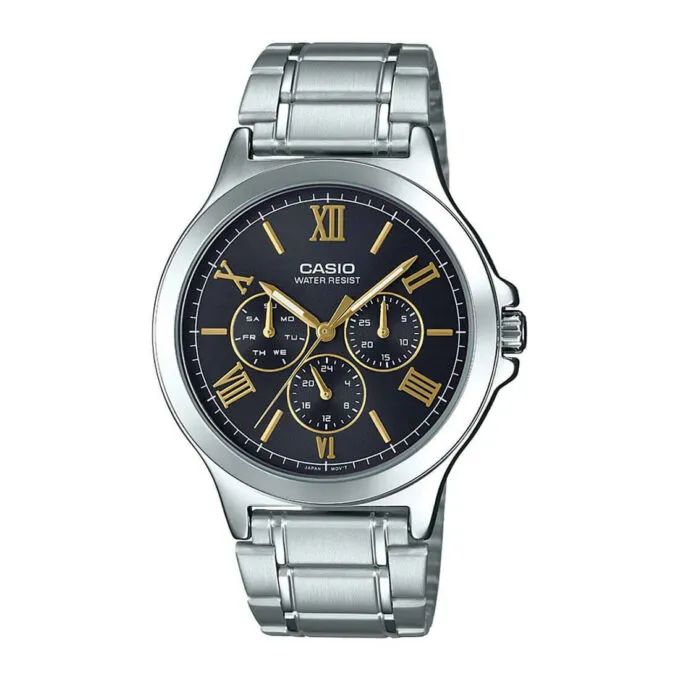 Casio Collection MTP-V300D-1A2UDF — элегантные часы с круглым стальным корпусом и минеральным стеклом, которые отображают время в форматах 12 и 24 часа. Также предусмотрены отдельные циферблаты для даты и дня недели. Комбинация штриховых и римских меток придает модели изысканный вид. Заводная головка защищена от повреждений. Батарейки хватит на 3 года работы. Заявленной влагозащиты хватит для мытья рук, поэтому в бассейн их лучше не брать. Финальный штрих — прочный браслет с тройной раскладывающейся застёжкой для максимального комфорта.