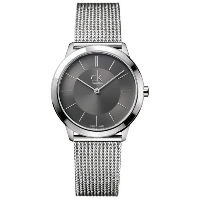 Calvin Klein Minimal K3M21124 получили стальной корпус, стальной плетёный ремешок, минеральное стекло и серый циферблат без цифр. Ничего лишнего в этих часах нет. Ещё один жирный плюс этой модели — толщина в 7 мм.