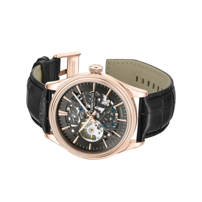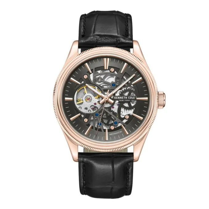 Лучший выбор для ценителей «скелетонов». Уникальность модели Kenneth Cole заключается в прозрачном циферблате, который оголяет механизм. Да, это самые доступные механические часы в этом топе. При этом они выглядят довольно престижно благодаря стальному корпусу в цвете «розовое золото» и чёрному кожаному ремешку.