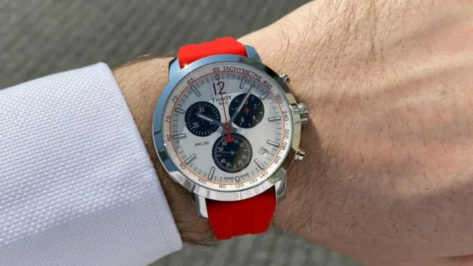 Наш лот — Tissot PRC 200 (T114.417.17.037.02) — предлагает круглый корпус из нержавеющей стали, сапфировое стекло и каучуковый ремешок. Ещё к плюсам можно приписать стрелки с люминесцентным покрытием, который светится в темноте, сочетание арабских цифр и штриховых меток, окошко даты и влагозащита 200WR (выдерживают погружение до 200 м).