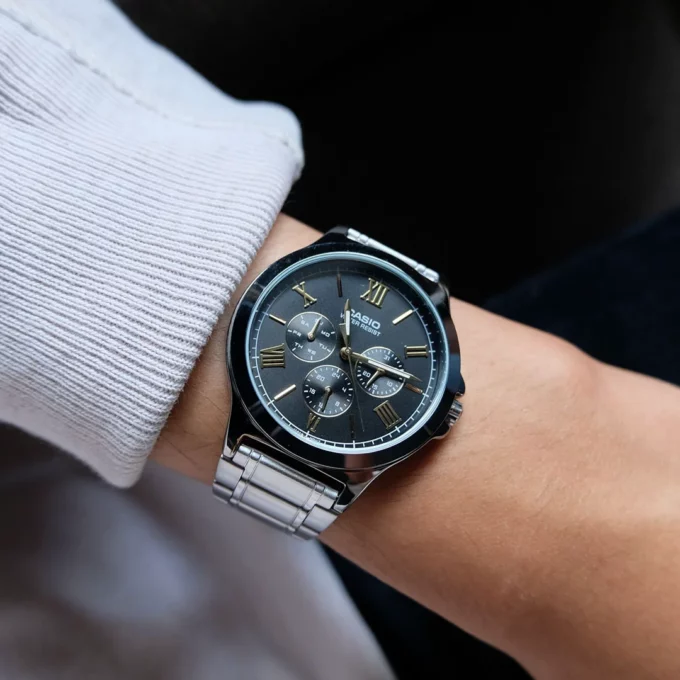 Открывает нашу подборку японская классика от Casio. Надёжные, в меру мощные, но главное — солидные часики. Casio Collection MTP-V300D-1A2UDF будут отлично смотреться и с деловым костюмом, и с джинсами под худи.