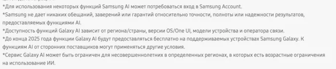 Но обычные покупатели могут не знать перед покупкой о важнейшем нюансе, связанном с Galaxy AI. Если внимательно вчитаться в информацию на официальном сайте, можно найти пункт, в котором Samsung уведомляет: AI-функциями можно будет пользоваться бесплатно только до конца 2025 года. Учитывая, что флагманские смартфоны люди берут в использование на годы использования, можно предположить, что корейцы плавно готовят пользователей к введению платной подписки на ИИ-фичи. Расчёт на то, что за год люди настолько привыкнут к новым фичам, что не захотят с ними расставаться.