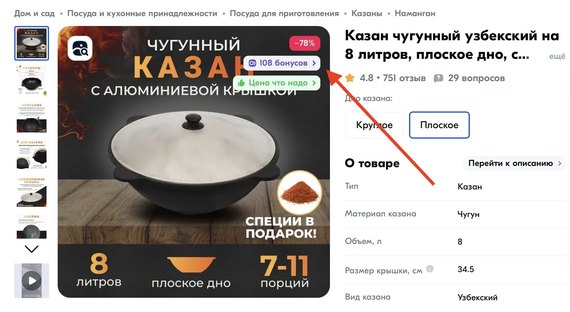 Теперь на карточках с товарами (в мобильном приложении — сразу под карточками) могут появляться специальные бейджи. На них указано, сколько бонусов продавец начислит за покупку конкретного товара. Например, за покупку товара ниже вам на баланс упадет 108 баллов.