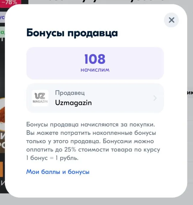 Затем эти баллы можно потратить на покупки товаров у этого же продавца. Списание происходит прямо в корзине — там можно выбрать, сколько баллов потратить на покупку. Баллами можно компенсировать не больше 25% от стоимости товара: например, если товар стоит 600 рублей, то можно потратить все 108 баллов. Бонусы продавца хранятся 3 дня, а потом сгорают.