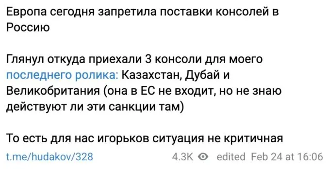Если вы все пропустили — популярные игровые консоли (PS, Xbox, Nintendo Switch) почти не поставляются на наш рынок из Европы напрямую. Точных цифры нет, но, как правило, их везут из азиатских стран. Для справки — европейские страны вообще не выпускают какие-либо известные массовые игровые приставки. Также поставщики довольно лихо научились обходить запреты с помощью параллельного импорта.
