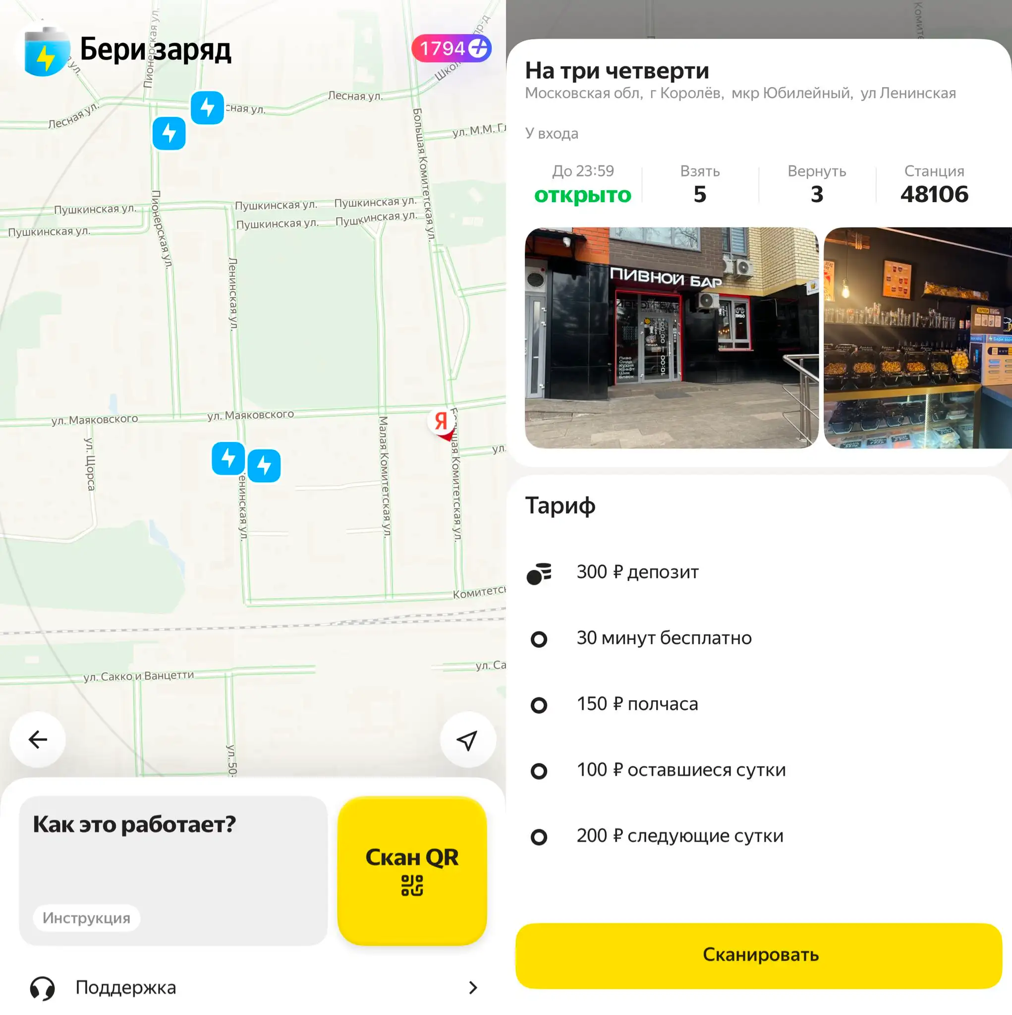 Паэурбанки находятся на специальных стендах в общественных местах — их можно найти в ТЦ, кафе, на вокзалах и прочих локациях. Сначала нужно отыскать место на карте в «Яндекс Go», затем отсканировать QR-код стенда и выбрать услугу. Например, можно арендовать батарею на полчаса, чтобы экстренно подзарядить телефон, или взять аккумулятор до конца суток.
