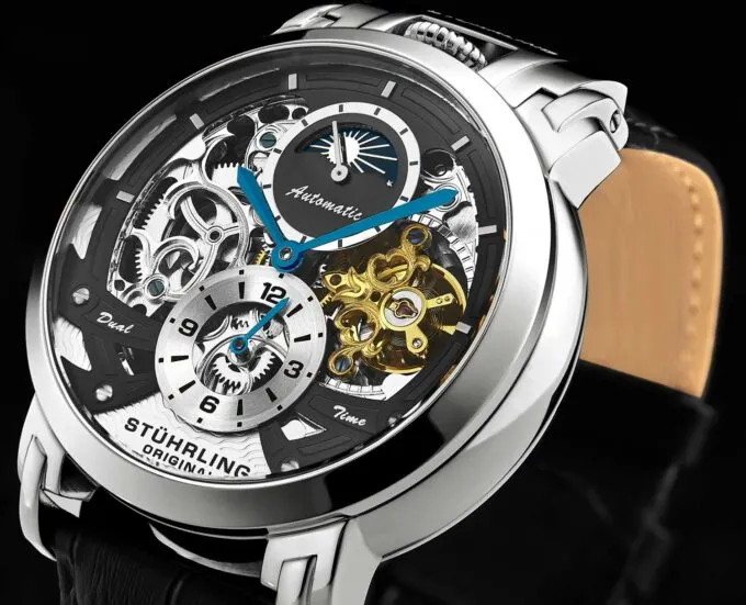 Stuhrling Legacy Menai 906.02 — элегантные часы-скелетоны с изысканным дизайном. В основе лежит калибр ST-90365 с 22 камнями, обеспечивающий точную работу. На циферблат вынесен индикатор день/ночь и второй часовой пояс.
