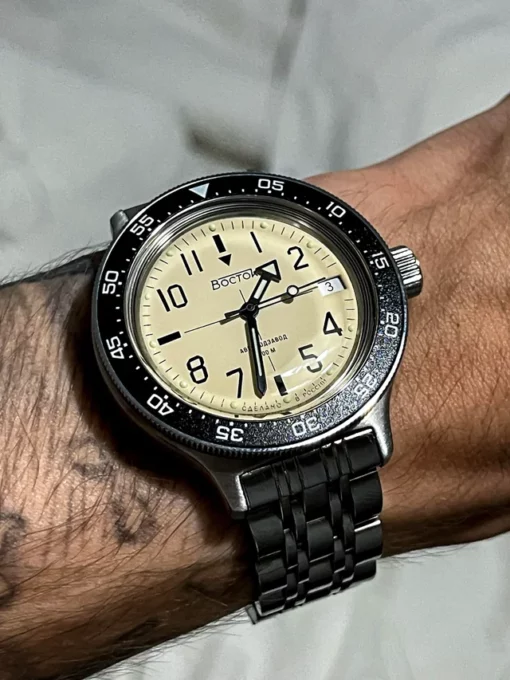Восток Амфибия 720070 — механические часы с ручным подзаводом, оснащенные надежным калибром Восток-2416Б. Корпус сделан из нержавеющей стали 316L, а органическое стекло защищает циферблат от повреждений. Часы также предлагают светонакопительное покрытие на стрелках и метках для удобного просмотра времени в темноте.