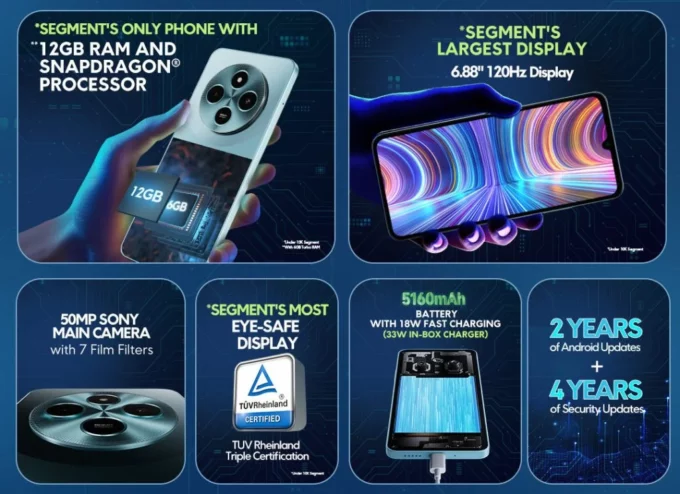Аппарат получил простой пластиковый корпус с защитой IP52. Он имеет 6,88-дюймовый IPS-дисплей с HD-разрешением, частотой 120 Гц и яркостью до 600 нит. Смартфон базируется на чипе Snapdragon 4 Gen 2, имеет от 6 Гбайт ОЗУ и 128 Гбайт встроенной памяти.