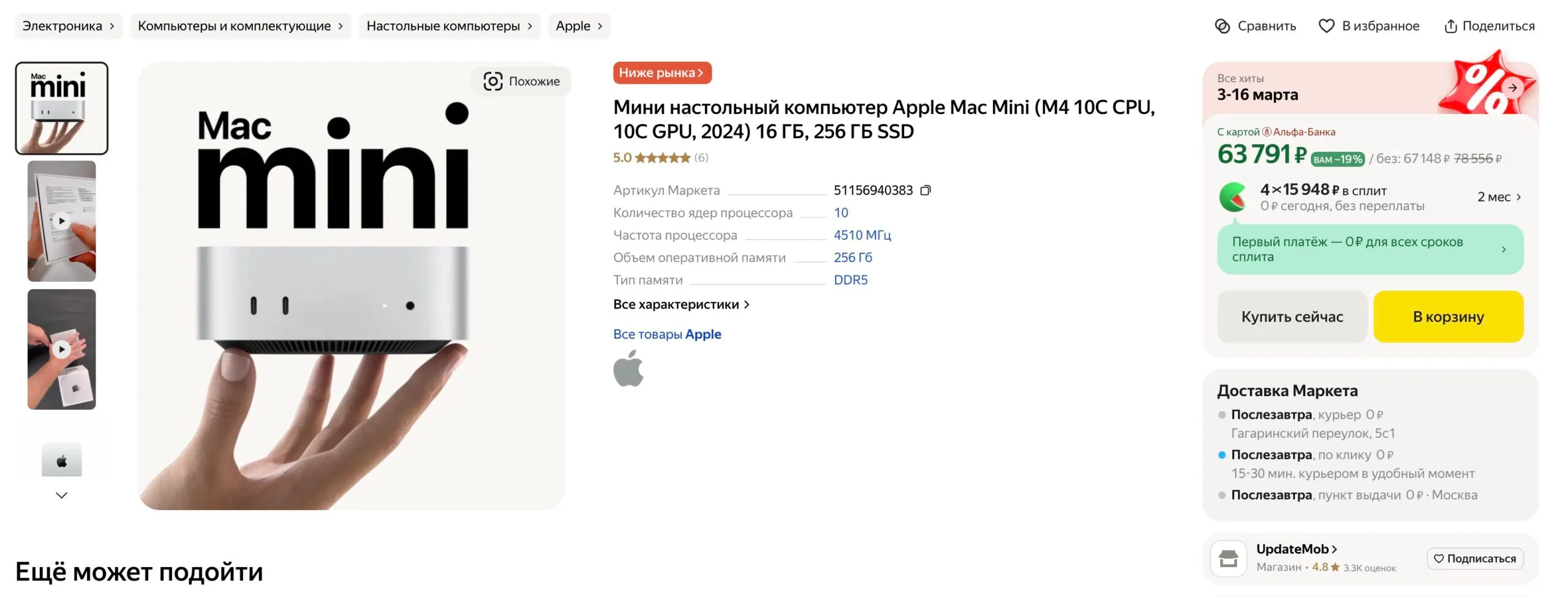 Внимания стоит только одна модель — новейший mini с процессором M4, который в базе можно приобрести за 64 тысячи рублей. За месяц ценник рухнул на 16К! Надо экстренно брать.