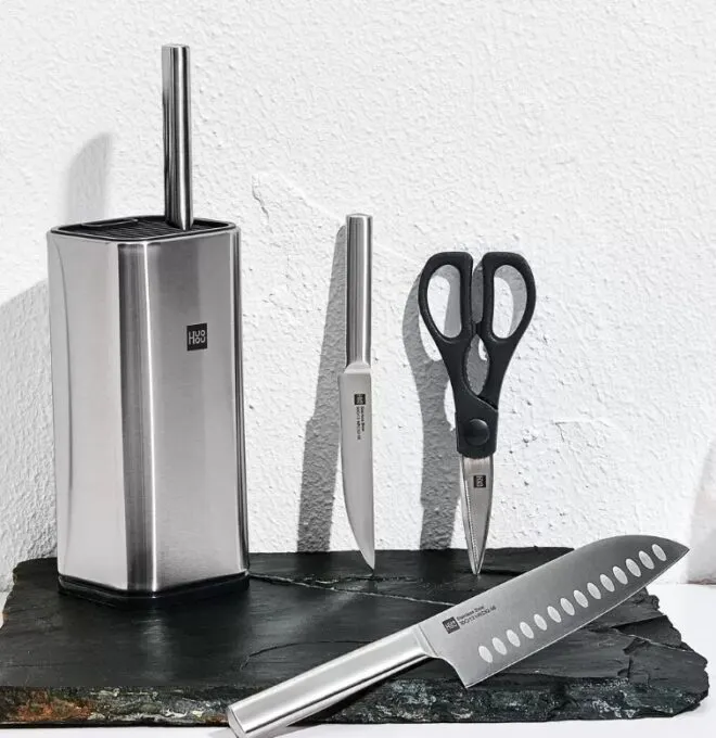 Комплект HuoHou Stainless Steel Kitchen Knife Set включает в себя три ножа: универсальный (126 мм), Сантоку (169 мм) и разделочный (178 мм), а также ножницы. У подставки предусмотрен сливной поддон, что избавляет от необходимости сушить ножи перед тем, как убрать их на место. Это экономит время и придаёт +100 к практичности сета.