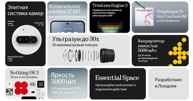 Оба телефона получили 6,77-дюймовый дисплей AMOLED с частотой 120 Гц и пиковой яркостью 3000 нит. Phone (3a) имеет 32-мегапиксельную фронтальную камеру, Phone (3a) Pro — 50-мегапиксельную селфи-камеру. Устройства работают на основе чипа Snapdragon 7S Gen 3, имеют 12 Гбайт ОЗУ и 256 Гбайт встроенной памяти. Также есть подсветка Glyph, новая кнопка Essential Space, батарея емкостью 5000 мАч, Android 15 и три года обновлений.