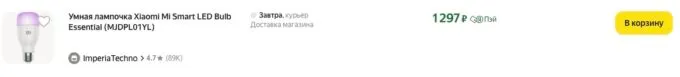 Сейчас на Яндекс Маркете умную лампу Xiaomi Mi LED Smart Bulb Essential можно купить за 1297 рублей, а с кэшбеками некоторых банков она обойдётся ещё дешевле.