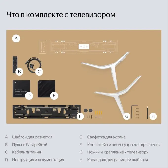 Самый жир в Яндекс ТВ Станции Про — комплектация. Тут инженеры Яндекса сделали всё на зависть конкурентам: в коробке лежат не только ножки и пульт, но и настенное крепление, трафарет для разметки, а также фирменная салфетка для ухода за экраном. Пожалуй, это лучший телевизор, который можно купить до 100 тысяч рублей.