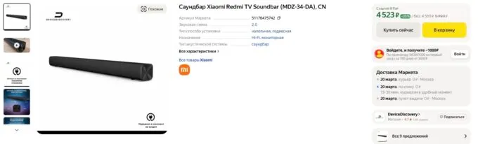 Прямо сейчас на Яндекс Маркете стильную аудиосистему Xiaomi Redmi TV Soundbar можно купить всего за 4523 рублей. А с кэшбеками некоторых банков она обойдётся дешевле.