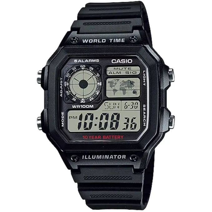 Casio AE-1200WH-1A — многофункциональные цифровые часы с прочным пластиковым корпусом и лаконичным дизайном. Они оснащены секундомером с точностью 1/100 секунды и возможностью измерения до 24 часов, таймером обратного отсчета (от 1 секунды до 24 часов), а также функцией мирового времени. Последние две фичи полезны для путешествий и любителей активного образа жизни.