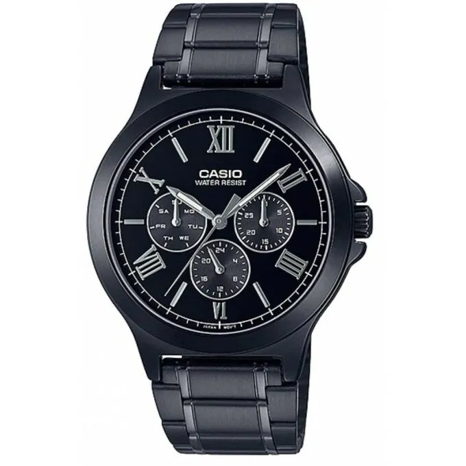 Casio Collection MTP-V300B-1A — универсальные часы для тех, кто ценит стиль и практичность в каждой детали. Их классический дизайн с метками в виде штрихов и римских цифр придает модели солидность, а чёрный циферблат создает контрастный, выразительный образ.
