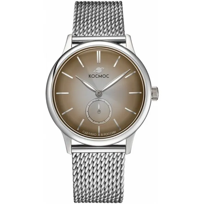 Космос Сириус K021.10.30 — часы с необычным дизайном. Профиль корпуса напоминает силуэт НЛО из-за выгнутой задней крышки и куполообразного стекла. Выглядит очень футуристично. Под сферическим минеральным стеклом — бежевый циферблат с градиентом. Часовая и минутная стрелки крупные, а секундная вынесена в отдельную зону в нижней части циферблата.