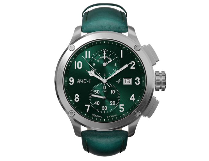 Корпус в Молнии АЧС-1 7.0 сделан из нержавеющей стали. При этом он получил практичную матовую отделку, чтобы не собирать царапины. Циферблат окрашен в насыщенный зелёный цвет, что придаёт модели большей люксовости. В темноте стрелки с люминесцентным покрытием Super-LumiNova светят довольно ярко. В комплекте идёт кожаный ремешок под цвет циферблата, но при желании его можно легко заменить на стальной браслет. Влагозащита в 100WR позволяет не снимать часы даже во время активного отдыха на воде.