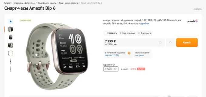 На Маркете Amazfit Bip 6 пока нет — доступны только часы прошлого поколения. Зато их можно приобрести в DNS, М.Видео и у прочих ритейлеров за 7999 рублей.