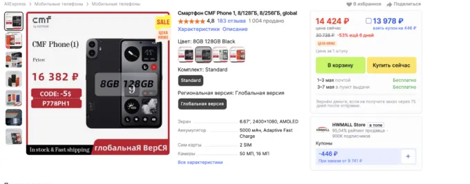 Именно по этим причинам мы на «Палаче» не всегда рекомендовали Phone 1 к покупке. Но считаем, что самое время присмотреться к нему сейчас, в апреле 2025 года. Заметили, что гаджет жёстко подешевел на AliExpress. Вероятно, компания готовится к выпуску новой модели, а продавцы из-за этого уже начали сливать старую модель со скидками. На момент написания заметки девайс можно приобрести на Али за 13 978 рублей с учётом купона продавца. Что касается версии на 256 Гб, то она доступна за 14 782 рубля.