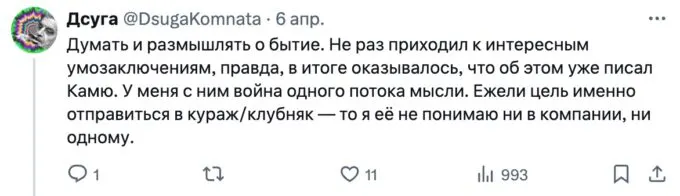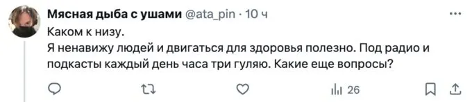 Пользовательница русского твиттера под ником «тошнит oт вceх» подогрела площадку простым вопросом — как правильно гулять одному? Твит за выходные собрал почти 200 тысяч просмотров и полтысячи комментариев.