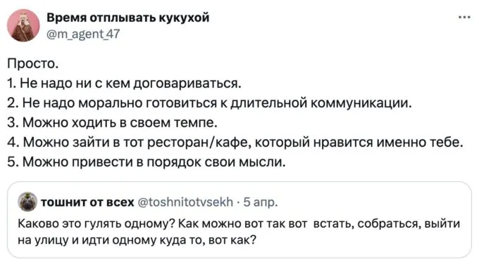 Напоследок — список преимуществ одиночных прогулок от пользователя «Время отплывать кукухой». Добавить нечего!