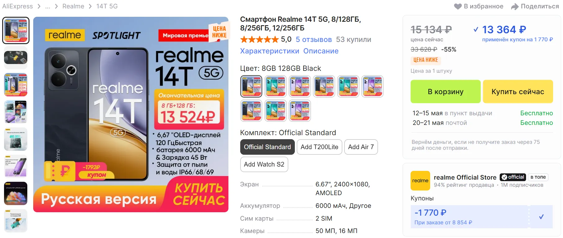 13 360 рублей — отличный прайс для такого смарта. Чтобы урвать Realme 14T по такой цене, нужно взять купон продавца на 1 770 рублей и после этого оформить заказ.