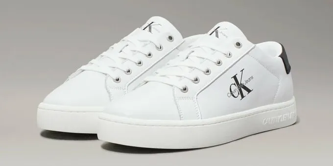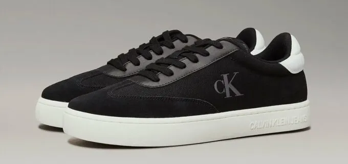Начнем с легких кедов Classic Cupsole, выполненных в черно-белой расцветке. Это обувь с массивной подошвой и дышащим верхом из полиэстера. На боковых частях айтема расположился фирменный логотип Calvin Klein, а подошва украшена названием бренда.