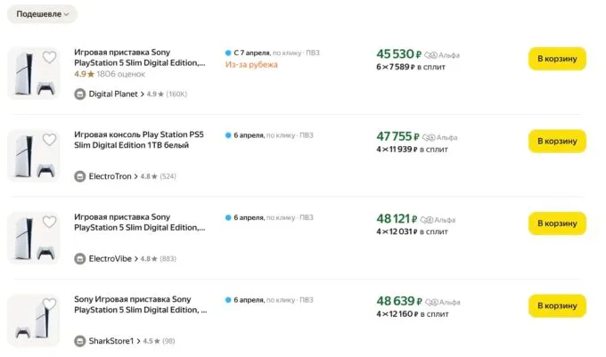 - PlayStation 5 Slim без дисковода — 47 800 рублей, прошлый месяц — 52 500 рублей